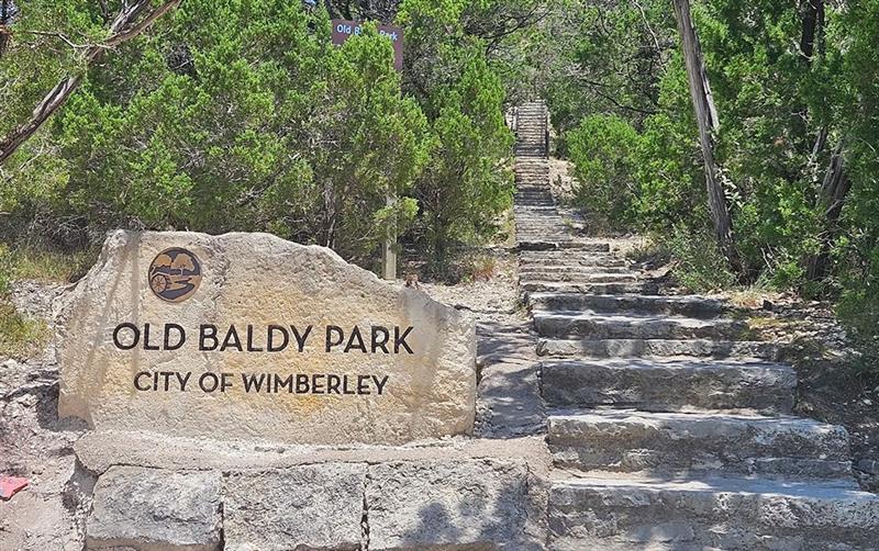 The stone entrance sign for Old Baldy Park in Wimberley, Texas, leading to a steep flight of rock stairs surrounded by cedar trees.
