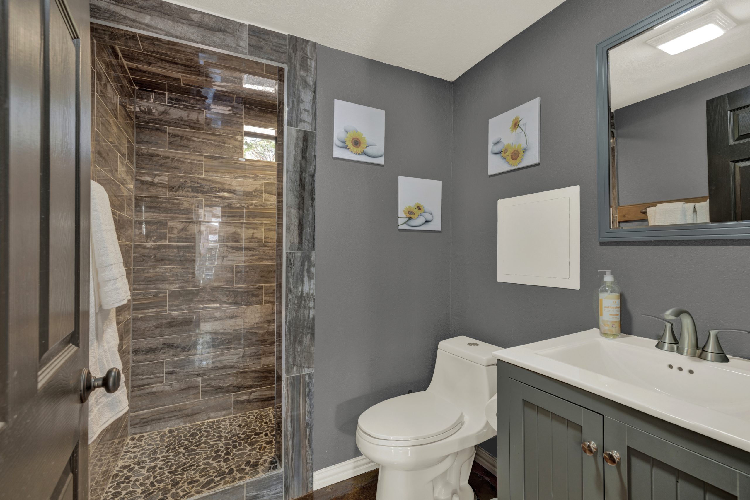 Casa Del Sol is a unique Quonset-style cabin that can sleep four people. The industrial-style kitchen is equipped with a stove, refrigerator, and Keurig coffee maker. The bedroom features a king-sized bed and a queen sleeper sofa for maximum comfort. The bathroom boasts a generously sized walk-in shower, and just outside, a comfortable sitting area beckons, inviting you to savor the breathtaking sunsets in style.