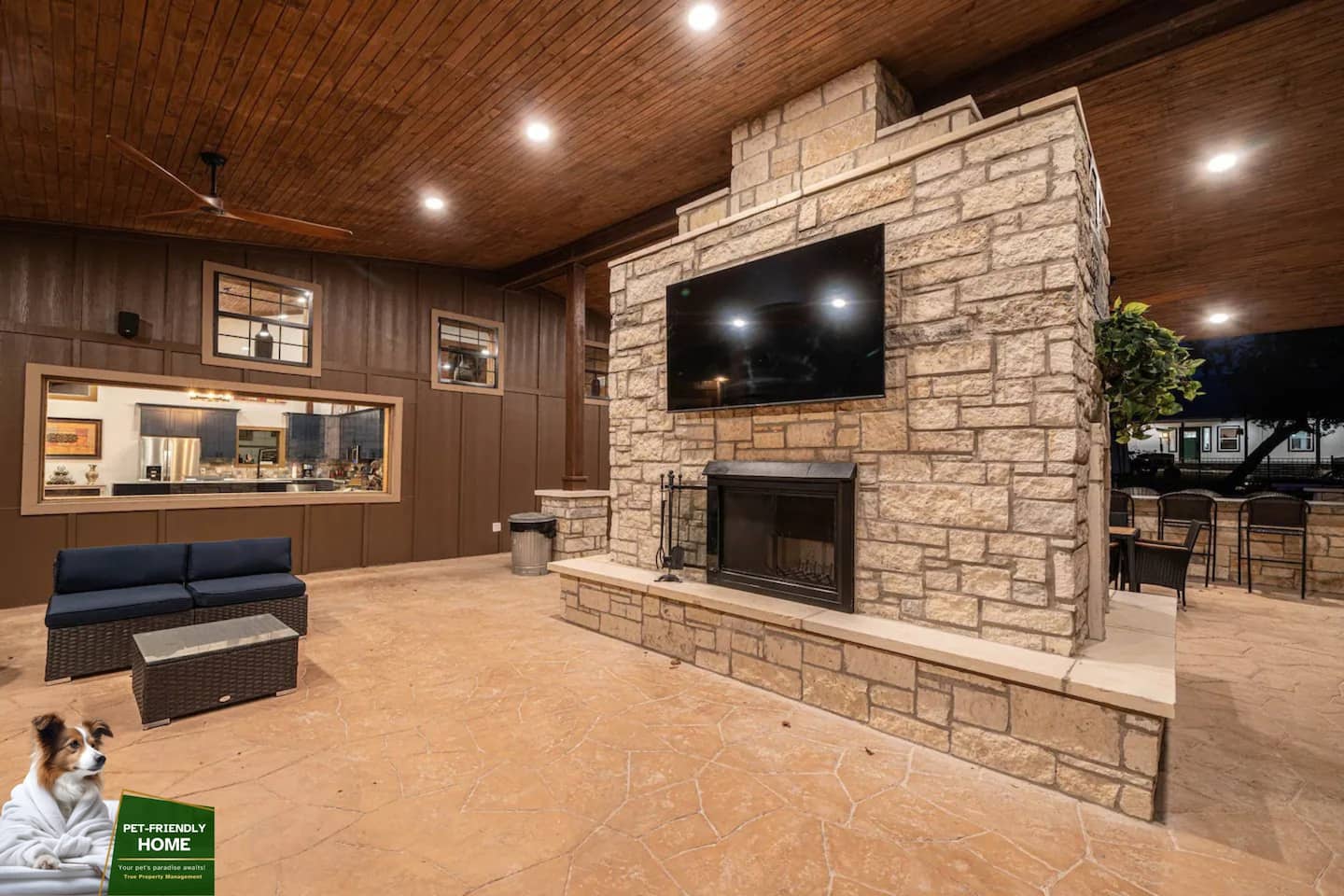 ✳Spacious living area with a cozy fireplace, perfect for gatherings.