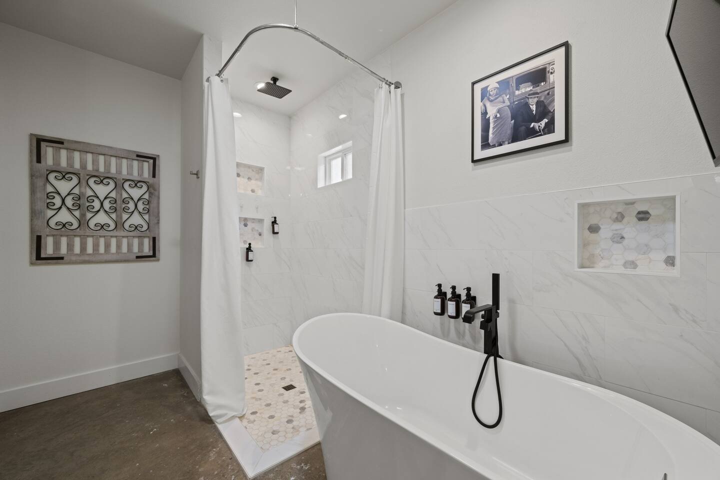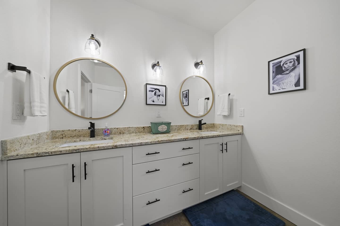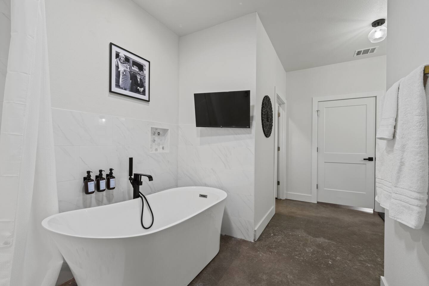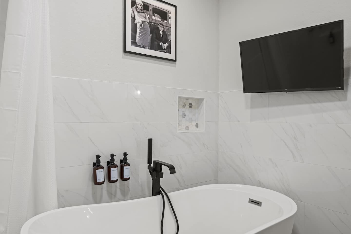 Masterfully decorated with your favorite classic TV shows, each bedroom offers a warm & inviting retreat that guests are sure to sleep soundly. Decorated in “I Love Lucy,” the master bedroom hosts a king bed with lovely linens & delightful accent pieces with colorful pops of soft yellow & orange. The bedroom also includes a large sleeper sofa for lounging or watching TV on the 65″ smart TV & can sleep 2 on the queen size pull out bed. Relax in a luxurious bubble bath while watching your favorite show, a walk in rain shower, private bidet toilet & a his & her vanity, adorned with Bonnie & Clyde.