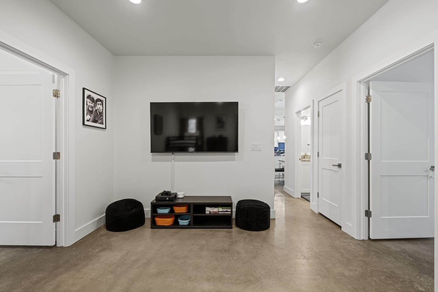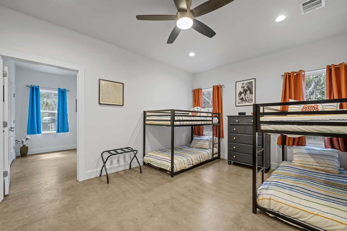 The Gilligan’s Island room is a den, which includes 2 sets of twin bunk beds, adorned with colorful linens. Your game lovers will enjoy themselves playing Xbox on the 65″ smart TV.