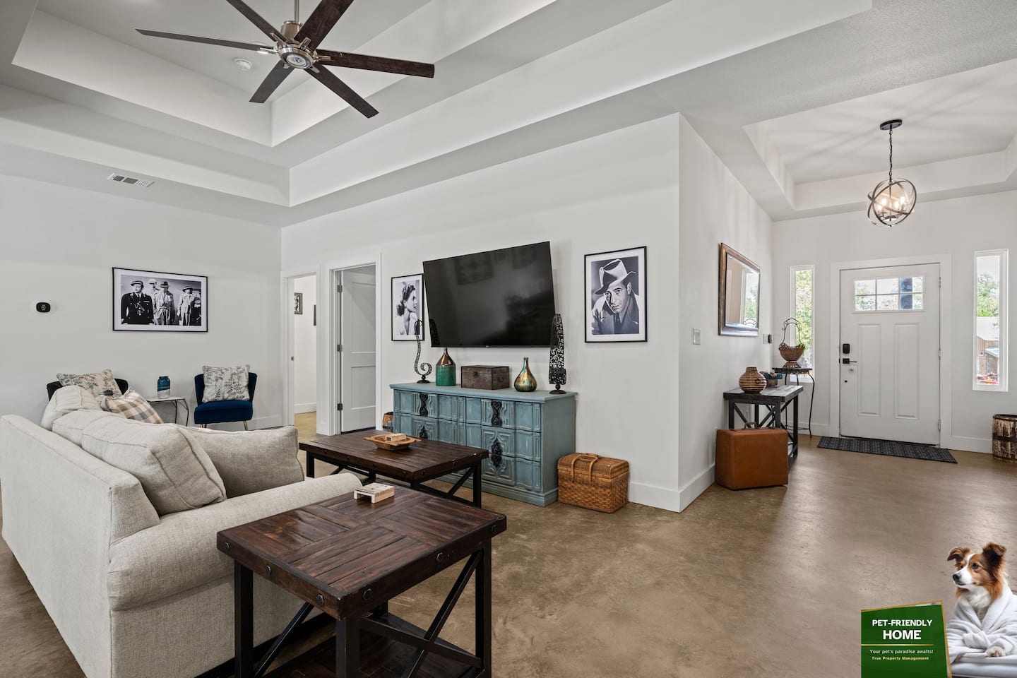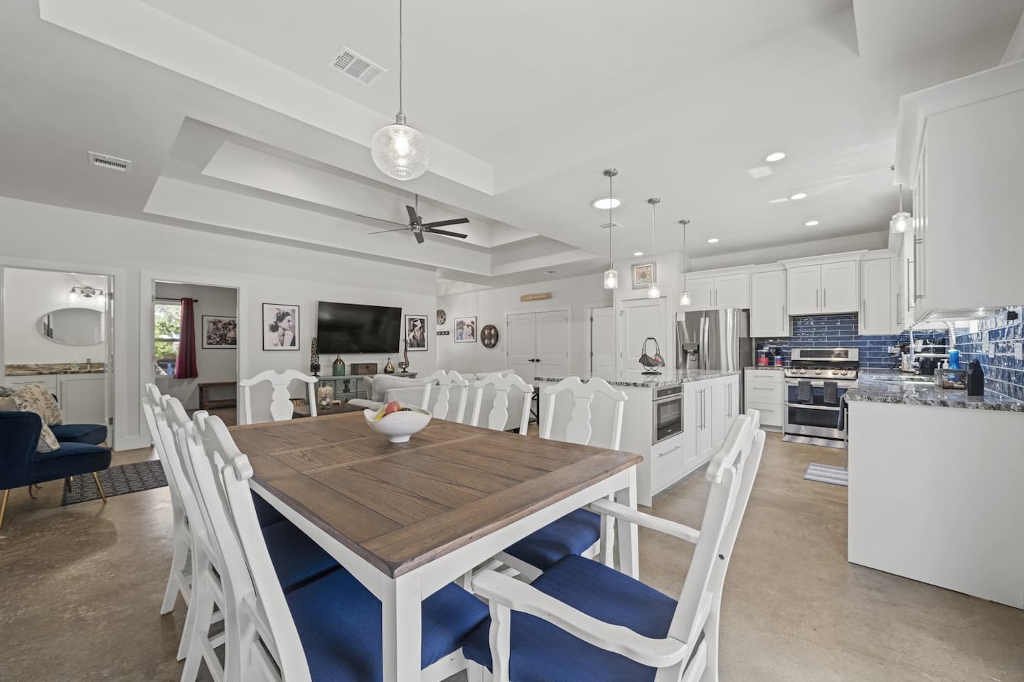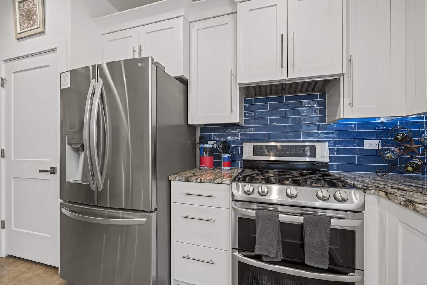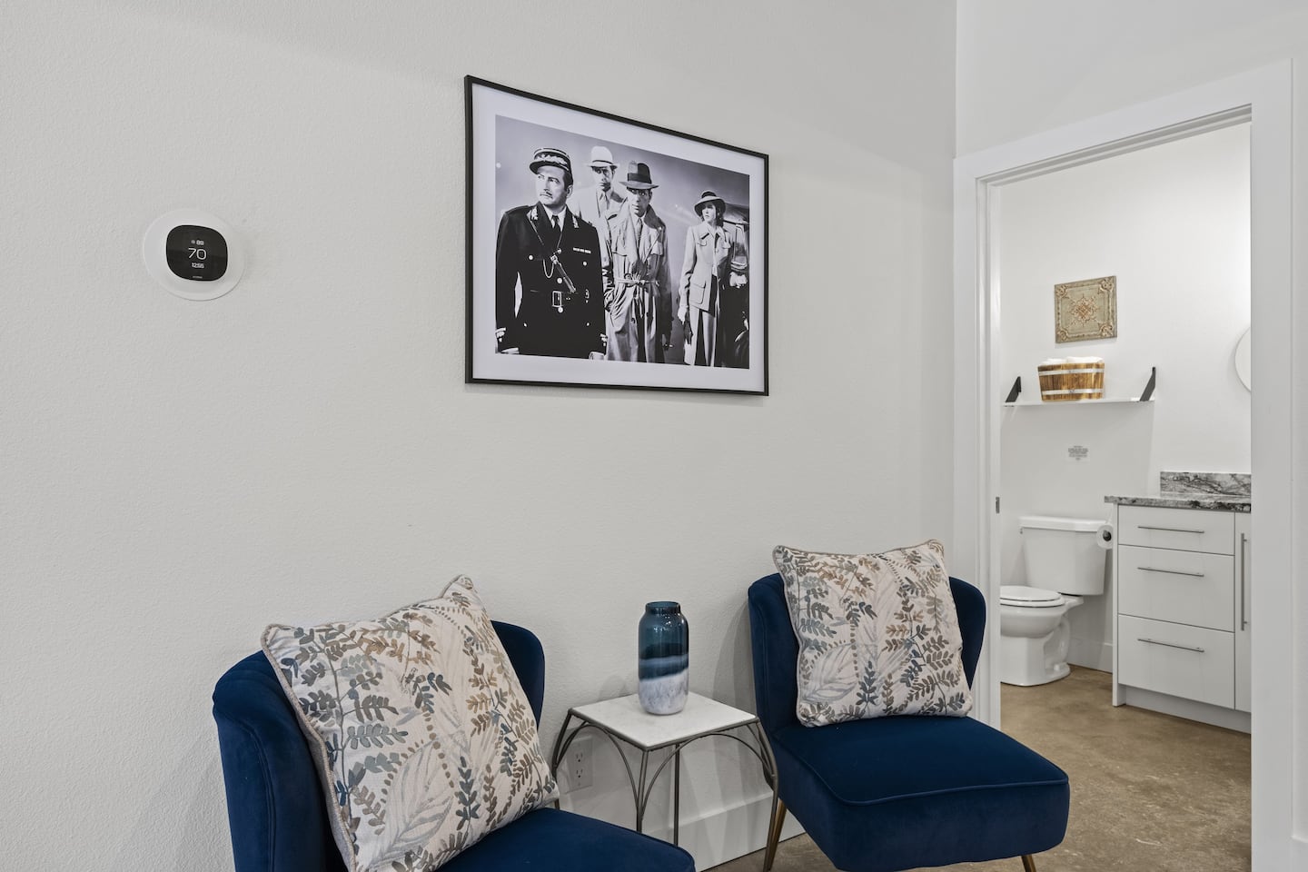 Upon entering, guests will be taken back in time with decor from an all time favorite classic movie, Casablanca. Relax in a warm & inviting sitting room with a 65″ smart T.V. for streaming, which is open to the spacious kitchen & dining room. Cooks will enjoy preparing meals in this open & modern kitchen with lots of storage, stocked with all of your cooking needs, large island with seating & plenty of counter space to appreciate family meals together.