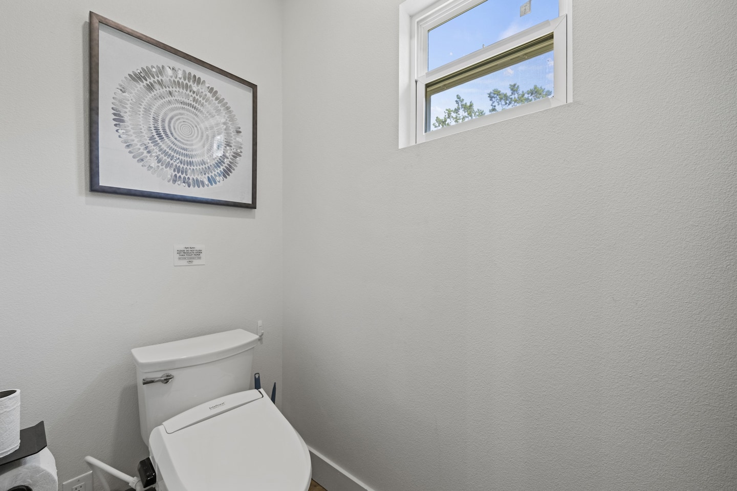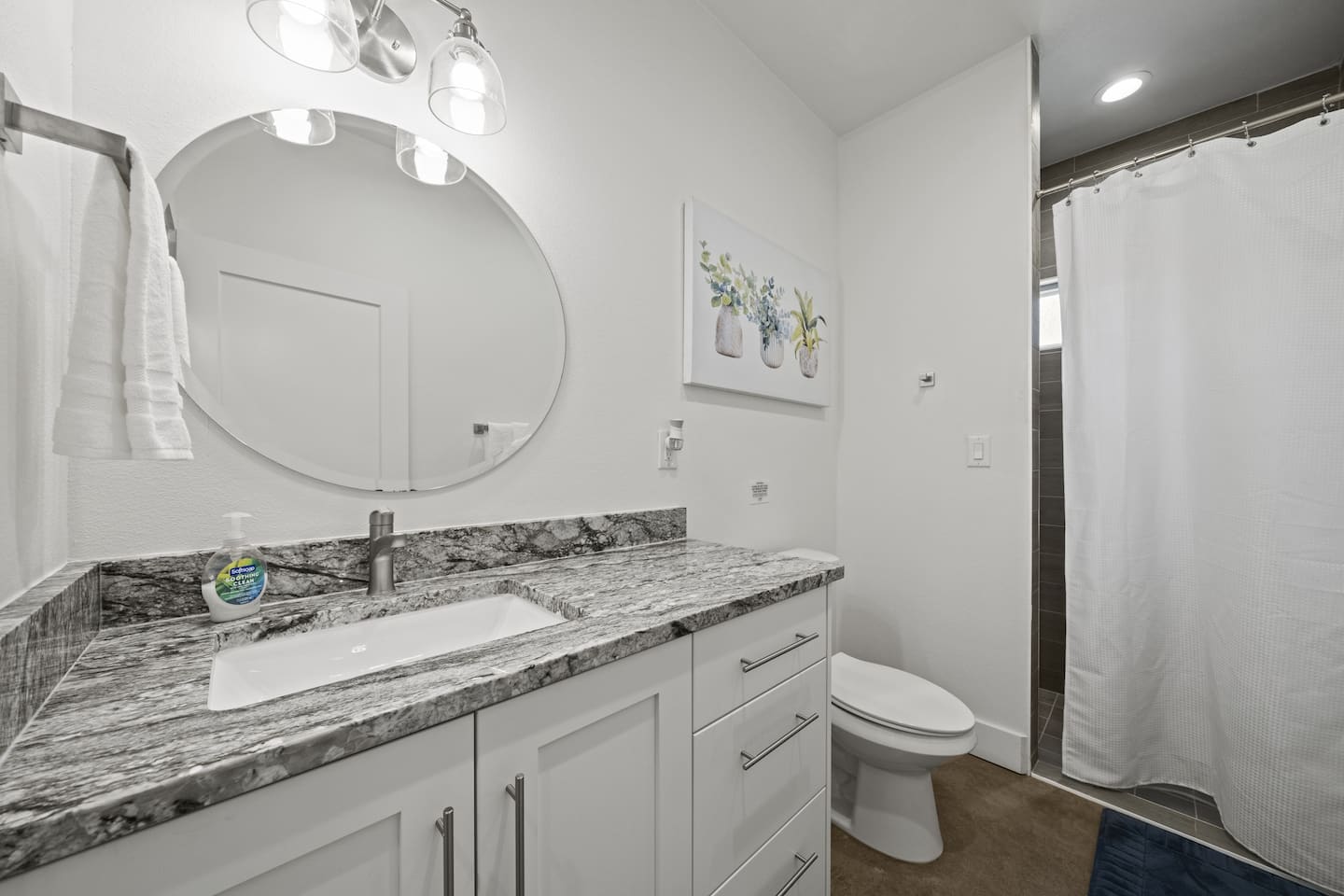 The third full bathroom is located in the hallway for all guests to access. It features a walk in shower, with beautiful tile work. Additionally, the home includes a half bath in the living room.